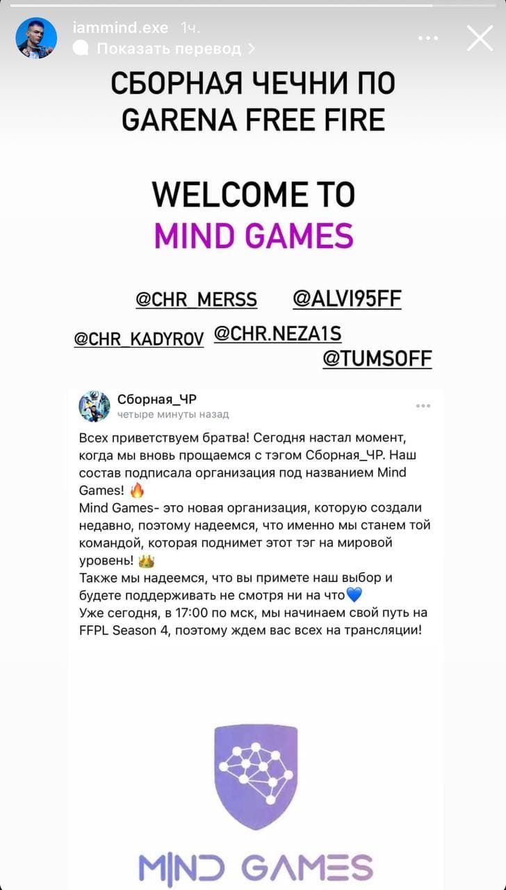 Молодой киберспортивный клуб Mind Games, владельцем которого является российский рэпер IAMMIND, подписал сборную Чечни по мобильной игре Free Fire. Об этом музыкант сообщил в своем Istagram-аккаунте. У клуба официальных сетей пока нет.