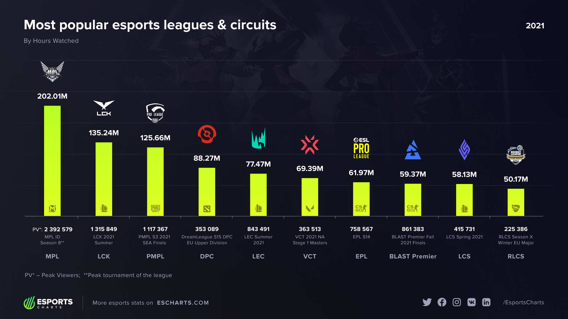 Портал Esports Charts предоставил статистику просмотров киберспортивных лиг в 2021 году. Самой популярной серией оказалась Mobile Legends: Bang Bang Professional League, на втором месте расположилась корейская региональная лига по League of Legends, на третьем — турнир по PUBG Mobile.