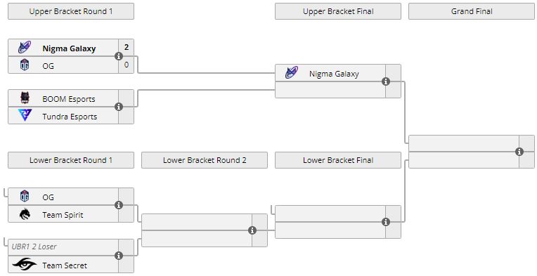 В финале верхней сетки Nigma сыграет с победителем пары BOOM — Tundra. OG сразится с Team Spirit на вылет с турнира.