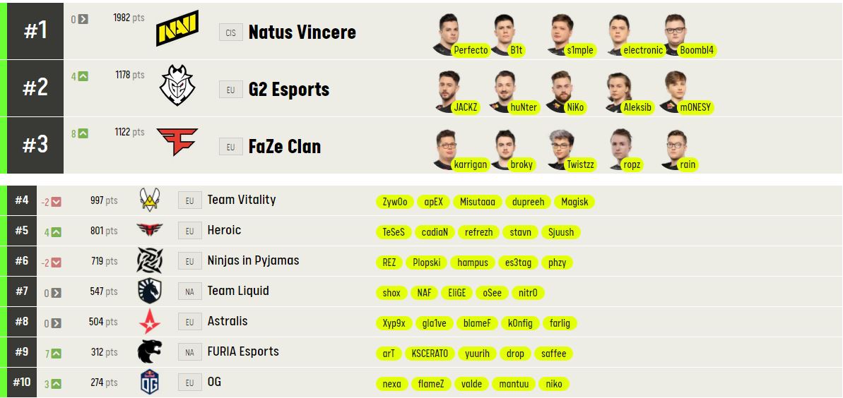 Организация ESL исключила Virtus.pro и Gambit из своего мирового рейтинга. Обновленный список команд доступен на ее официальном сайте. Отметим, первую строчку рейтинга занимают Natus Vincere.