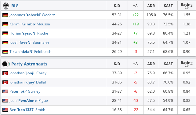 BIG — Party Astronauts — 2:0 (Overpass — 16:9, Dust2 — 16:10);