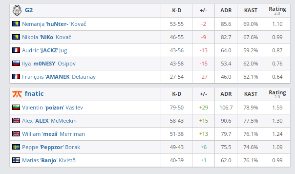 Fnatic победила в матче группового этапа ESL Pro League Season 15. Организация обыграла G2 со счетом 2:1 (Inferno — 14:16, Dust2 — 16:2, Mirage —16:7,).