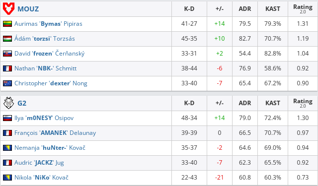 Команда G2 не сумела ничего противопоставить коллективу MOUZ в матче группы “А” ESL Pro League Season 15. “Мышки” забрали в свой актив “сухую” победу — 2:0 (Nuke — 16:12, Mirage — 19:17).