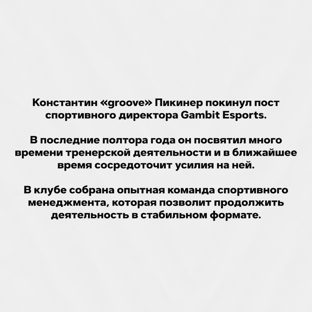 Константин groove Пикинер покинул пост спортивного директора Gambit. Об этом организация сообщила на своей странице в VK.