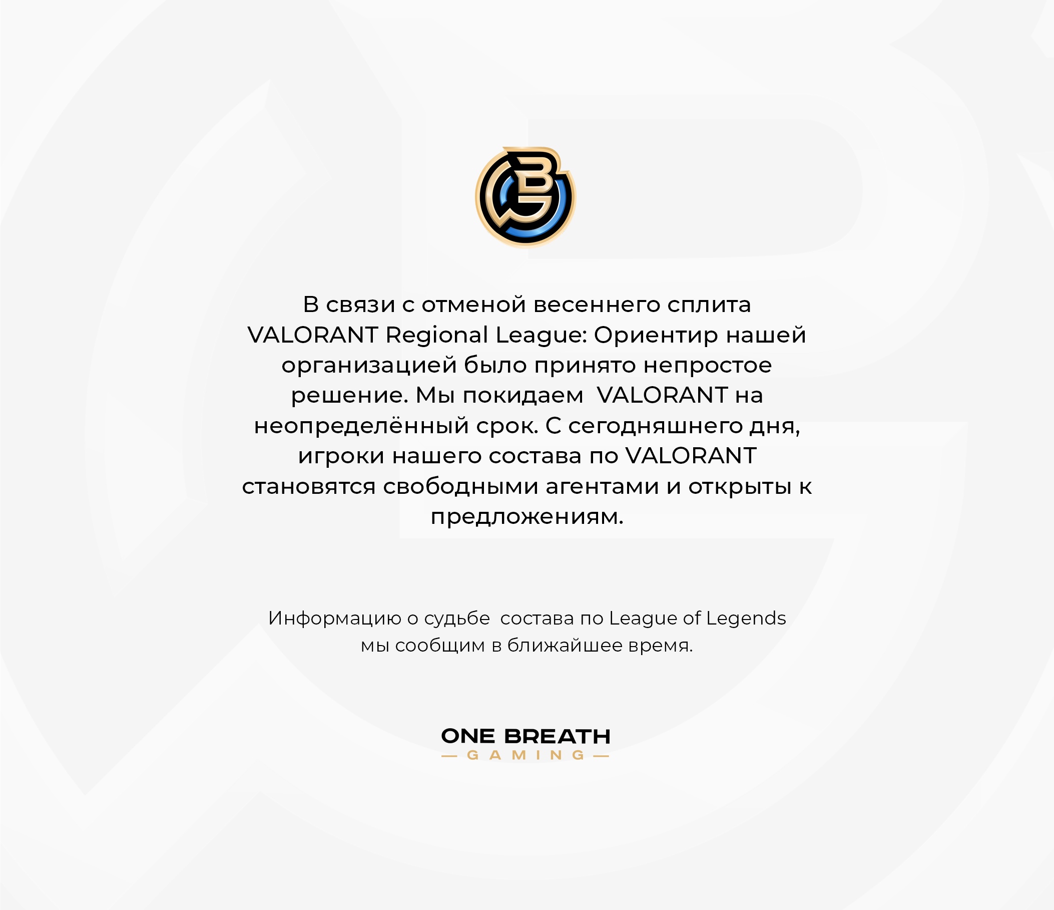 Организация One Breath Gaming распустила состав по VALORANT. Об этом стало известно в официальном сообществе OBG в VK. Причиной такого решения является отмена VALORANT Regional League.