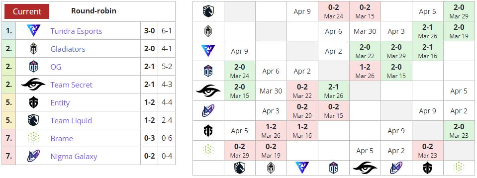 Победа позволила Tundra выйти на первую строчку в таблице. Liquid поднялась на пятое место. Nigma и Brame делят последнюю строчку в дивизионе.