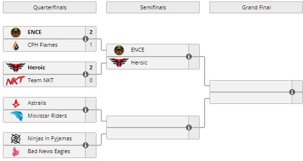 Copenhagen Flames и CPH покинули турнир на 5-8 месте. ENCE и Heroic 29 апреля сразятся за выход в гранд-финал турнира.