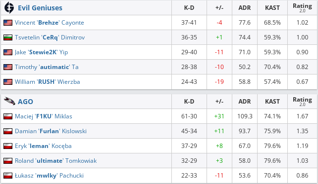 Evil Geniuses — AGO — 0:2 (Dust2 — 11:16, Inferno — 11:16).
