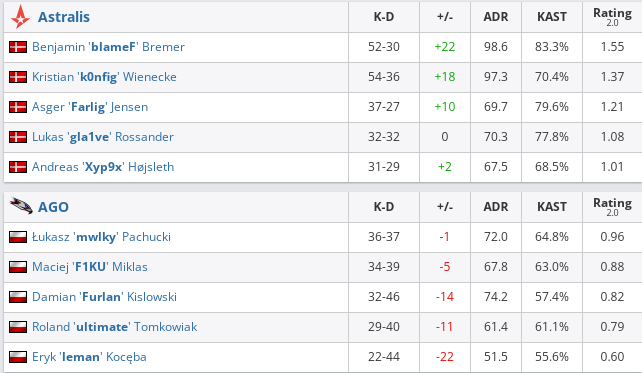 Astralis — AGO — 2:0 (Mirage –16:13, Nuke — 16:9)