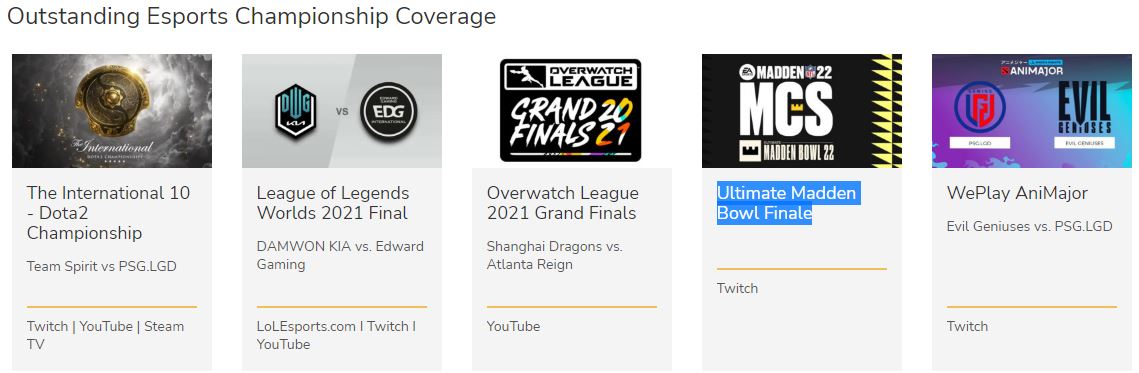 Помимо гранд-финала, на “выдающееся освещение киберспортивного турнира” были номинированы финал Worlds 2021 по LoL, решающие матчи Overwatch League, Ultimate Madden Bowl Finale и матч между EG и PSG.LGD в рамках AniMajor.