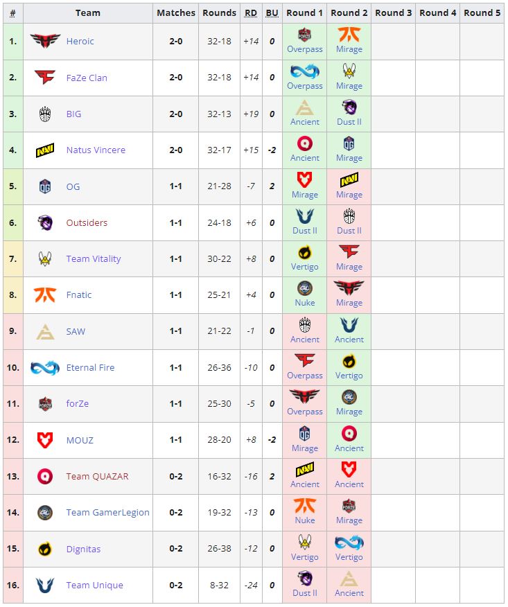 Завершился первый игровой день в рамках группы “А” на PGL Major Antwerp 2022: European RMR. Heroic, FaZe Clan, BIG и NaVi идут без поражений. QUAZAR, GamerLegion, Dignitas и Unique находятся в шаге от вылета.