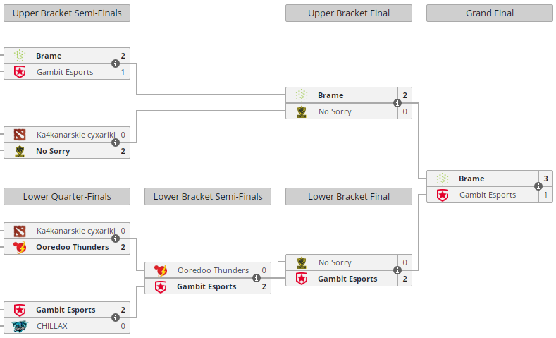 Brame стала триумфатором десятого сезона Dota 2 Champions League. В гранд-финале греки были сильнее Gambit, за которую выступают беларусы Никита pantomem Балаганин и Алексей Smiling Knight Свиридов. Итоговый счет — 3:1.