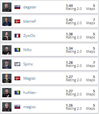 Вторым по этому показателю стал Бенджамин blameF Бремер из Astralis — 1.42. Матье ZywOo Эрбо из Vitality — третий (1.38).