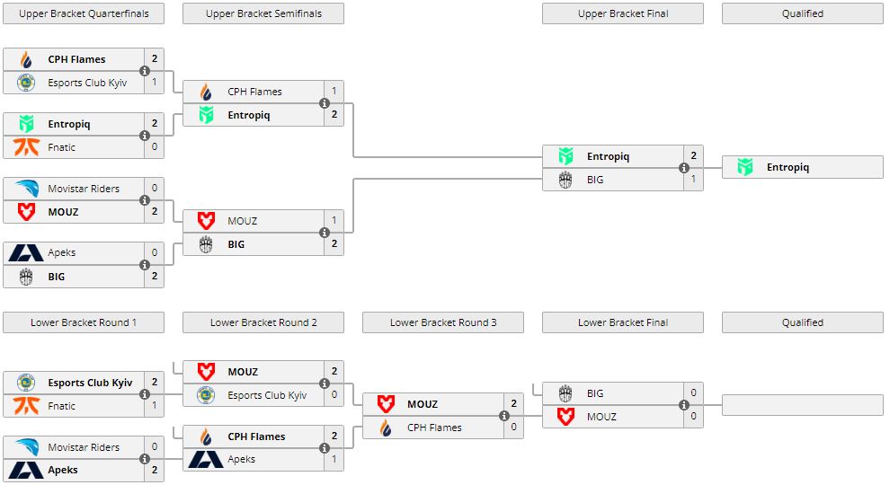 Организация Entropiq заработала путевку на IEM Dallas 2022 по CS:GO. В матче за слот коллектив обыграл BIG — 2:1 (Ancient — 16:12, Mirage — 14:16, Nuke — 16:9).