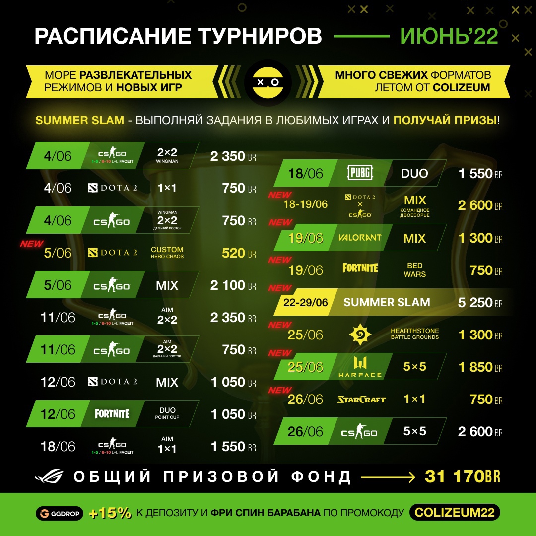 Минский компьютерный клуб COLIZEUM (ул. Притыцкого, 23А) в своей группе во ВКонтакте опубликовал расписание турниров на июнь 2022 года с суммарным призовым фондом 31 170 белорусских рублей. Соревнования пройдут по CS:GO, Dota 2, Valorant, Hearthstone, WarFace, Apex Legends, Fortnite и StarCraft.