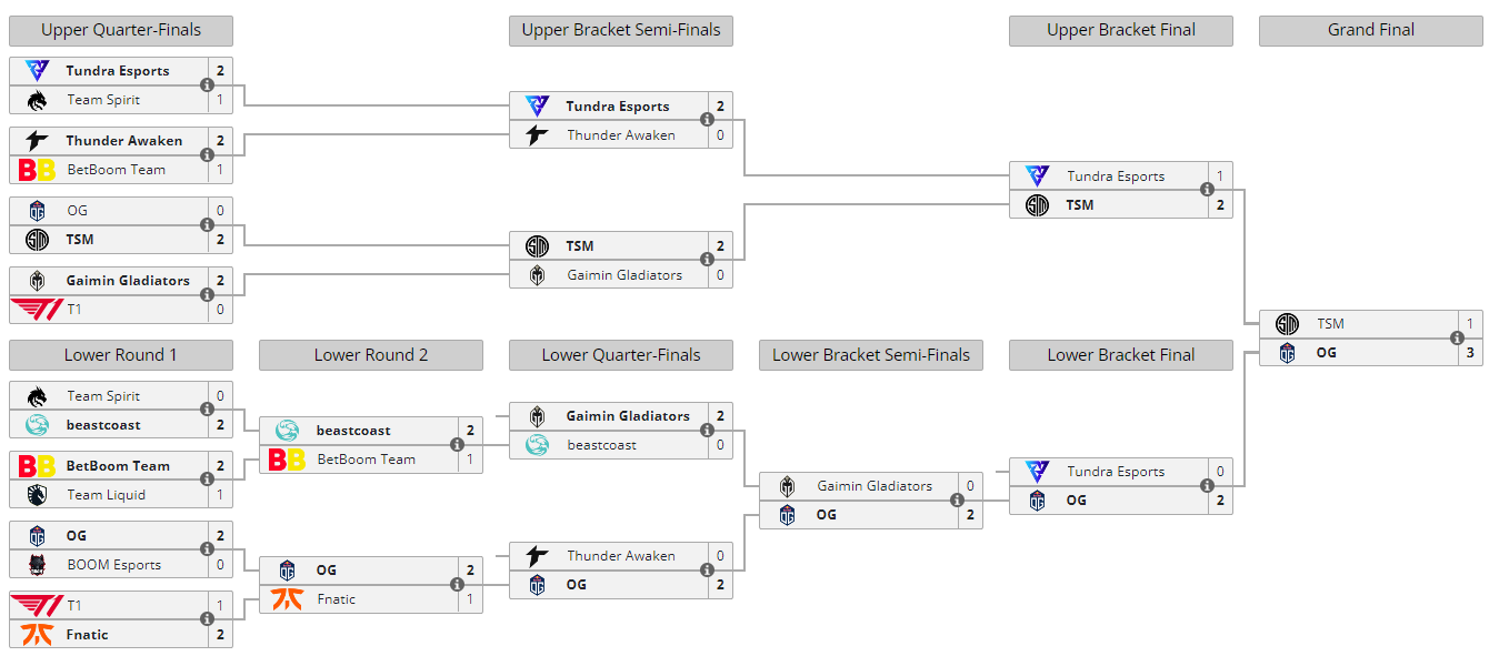 В гранд-финале ESL One Stockholm 2022 команда OG со счетом 3:1 обыграла состав TSM, заработав $200 000 и 680 DPC Points. Североамериканской команде досталось $100 000 и 610 DPC Points.
