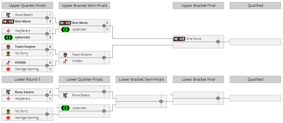 В параллельной встрече коллектив One Move с белорусами Алексеем Smiling Knight Свиридовым и Никитой Pantomem Балаганиным без проблем обыграл cybercats — 2:0.