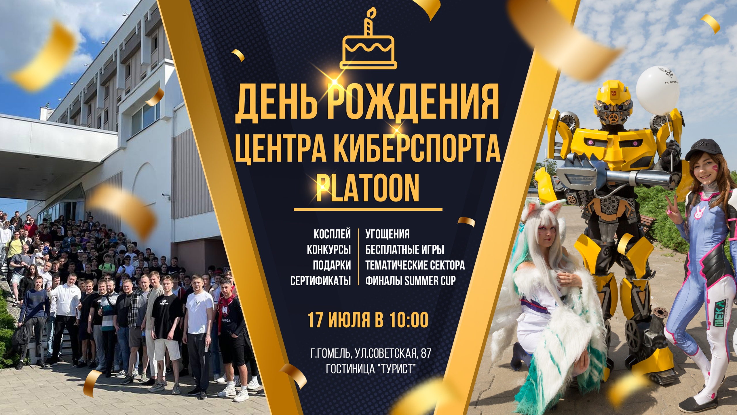 Гомельский Центр киберспорта PLATOON анонсировал ивент, посвященный году со дня открытия площадки. Организаторы обещают проведение конкурсов с призами и подарками, угощения и много других интересных активностей. Также в это день состоится финал турнира PLATOON SUMMER CUP по CS:GO и StarCraft II. Мероприятие пройдет 17 июля по адресу г. Гомель, ул. Советская, 87. Начало в 10.00.