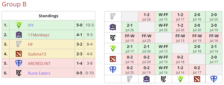 Результаты группы B стали известны еще вчера. Напомним, команды IVY и 11Monkeyz с белорусом Palantimos вышли в верхнюю сетку плей-оффф, коллективы HF с белорусами klassnokruto и sohy, а также Gubina13 с нашим соотечественником HappyDyurara продолжат свое выступление в нижней сетке плей-офф, а составы ARCRED.INT и Rune Eaters покинули турнир.
