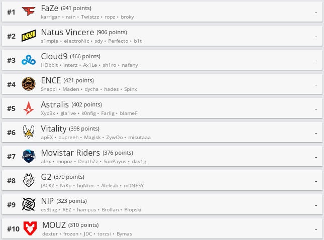 Портал HLTV.org вновь обновил свой ретинг команд CS:GO. Неделя с 18 по 25 июля оказалась крайне спокойной. В топ-30 картина практически не изменилась. Лидирующую позиции все еще занимает FaZe Clan, следом расположились ребята из NaVi, замкнула тройку Cloud9.