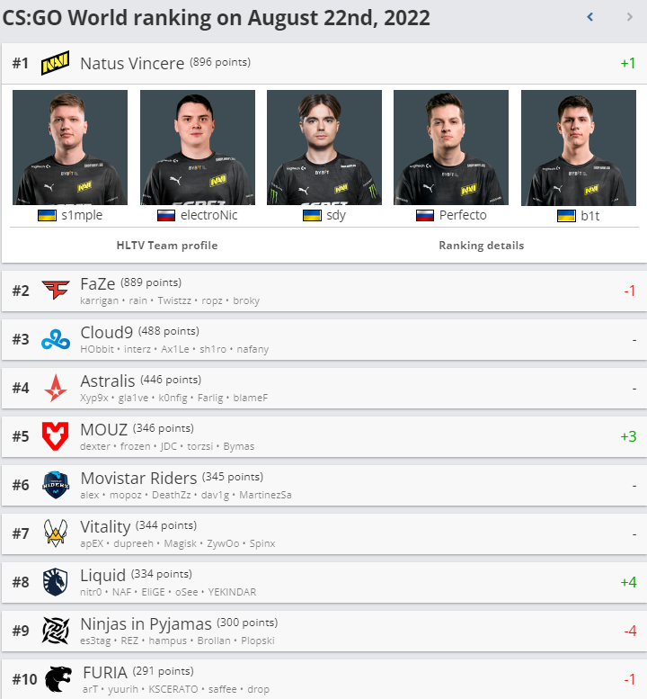 Портал hltv.org опубликовал обновленный рейтинг лучших команд по CS:GO. В нем NaVi вновь вернулись на первое место, обойдя FaZe Clan на 7 очков. Смена произошла благодаря победе черно-желтых в группе А на BLAST Premier: Fall Groups 2022.