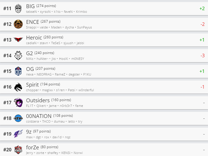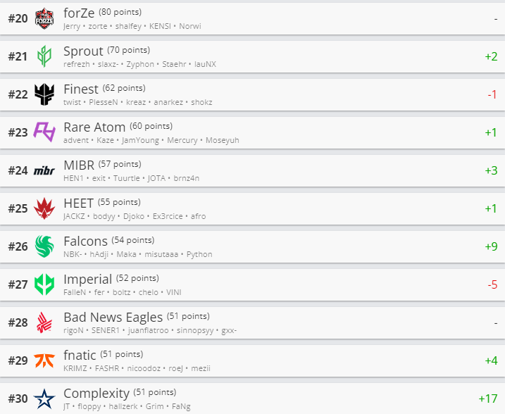 Неожиданный рывок совершили Complexity. Они поднялись сразу на 17 позиций, замкнув тем самым топ-30.