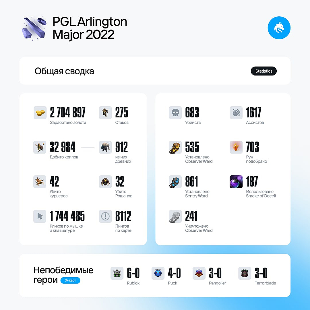 Игроки Team Spirit совершили 683 фрага на PGL Arlington Major 2022. Такую информацию опубликовал официальный аккаунт “драконов” в телеграме. Также согласно статистике Spirit ни разу на турнире не проиграла с Rubick — 6:0.