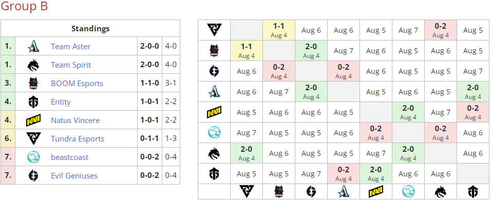 По итогам первого дня в лидеры таблицы вырвались Aster и Spirit. EG и beastcoast не смогли выиграть ни одной карты.