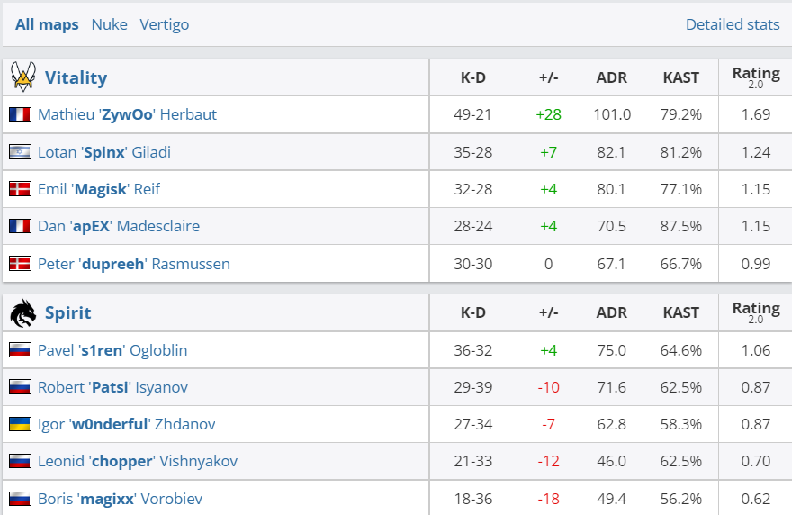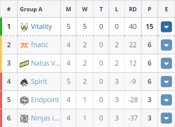 Team Vitality вышла в четвертьфинал турнира с первого места группы А. Коллектив выиграл на 40 раундов больше, чем проиграл. Team Spirit после поражения покинула турнир без шансов выхода в плей-офф.