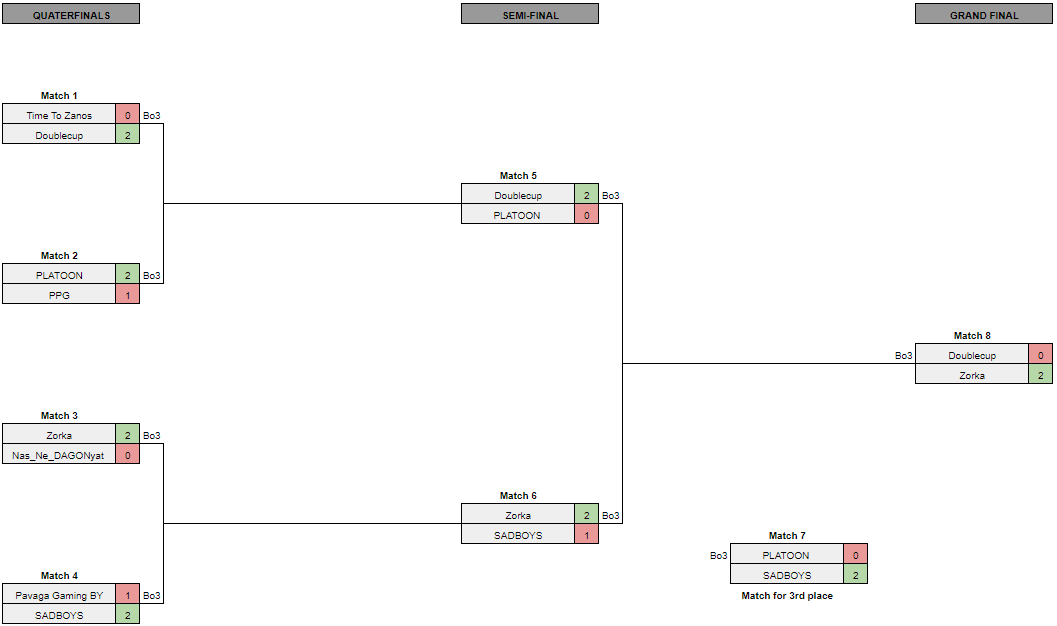 Вместе с титулом чемпиона Zorka заработала 1500 рублей. Выигрыш DOUBLECUP составил 1000 рублей. Занявшая третье место PLATOON получила всего 500 рублей.