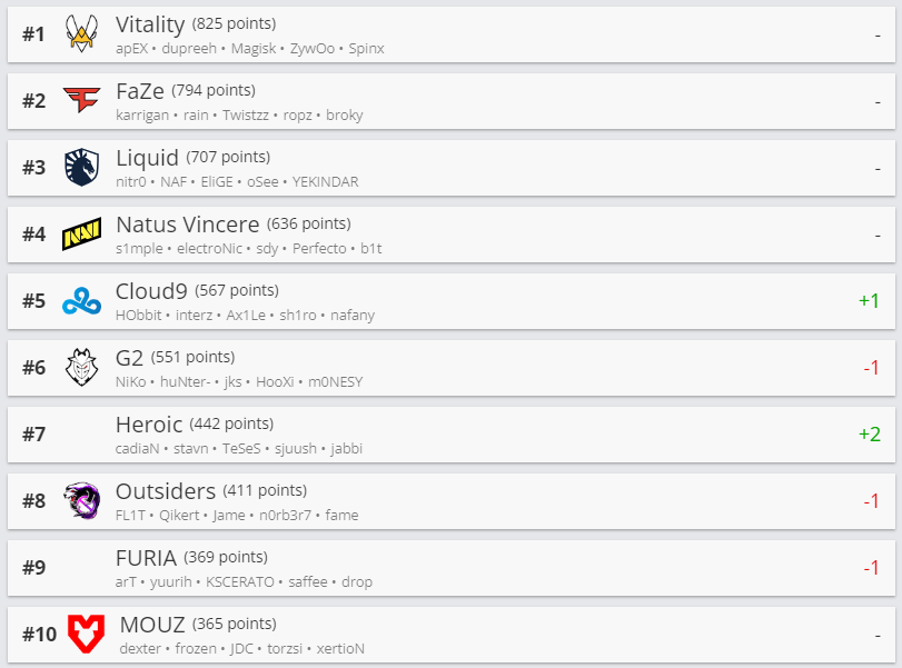Традиционно в начале недели ресурс HLTV.org обновил рейтинг лучших команд мира в CS:GO. В первой десятке существенных изменений не произошло. Team Vitality, FaZe Clan и Team Liquid по-прежнему сохраняют лидерство.