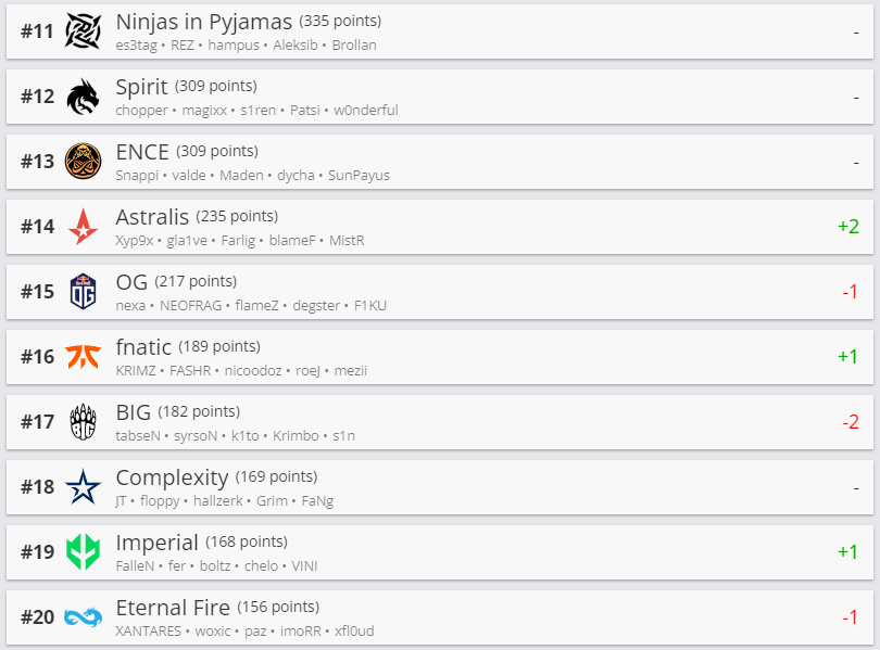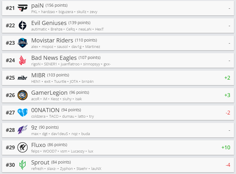 После стремительного подъема на прошлой неделе Nemiga Gaming потеряла 7 позиций и расположилась на 98 месте рейтинга. Белорусская команда Websterz (ex-GoodJob) прибавила 15 строчек и теперь находится на 79 месте. Позиция 1WIN с белорусом Игорем lollipop21k Солодковым на этой неделе осталась без изменений, команда все еще на 31 строчке.