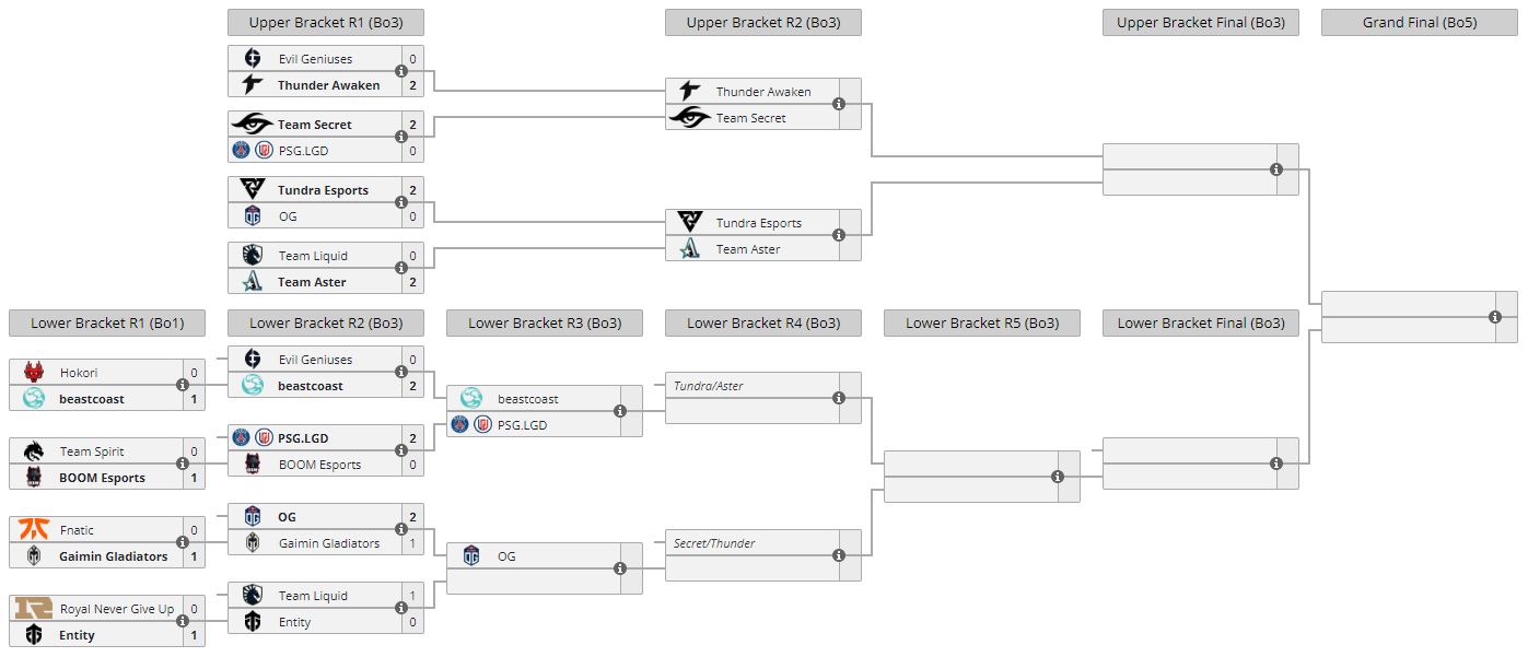 Gaimin Gladiators покинули турнир на 9-12 месте. OG прошла в третий раунд нижней сетки, где сыграет с победителем пары Entity — Liquid.