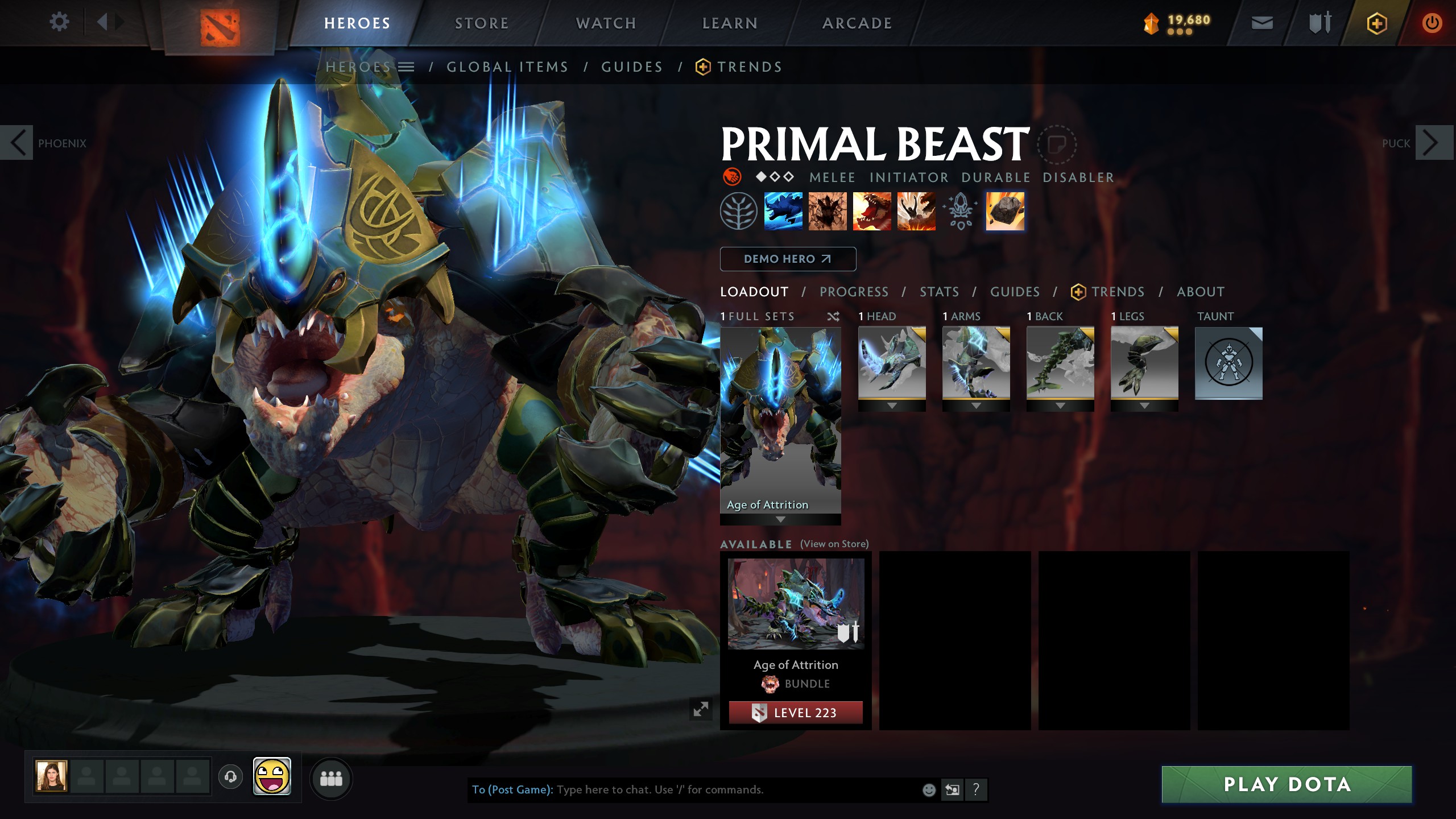 В ночь на 7 октября Valve выпустила косметические предметы для Primal Beast. Первой “обновкой” для персонажа стал Immortal-сет Age of Attrition, который состоит из четырех предметов. Набор изменяет иконку способности Onslaught, а также добавляет новые анимации и звуковые эффекты. Получить сет можно за достижение 223 уровня Боевого пропуска.