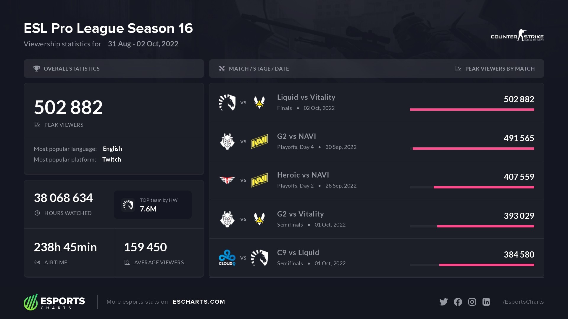 Портал Esports Charts опубликовал статистику просмотров с ESL Pro League Season 16. В пике за гранд-финалом турнира между Vitality и Liquid наблюдали 502 тыс. человек — это самый популярный матч турнира.
