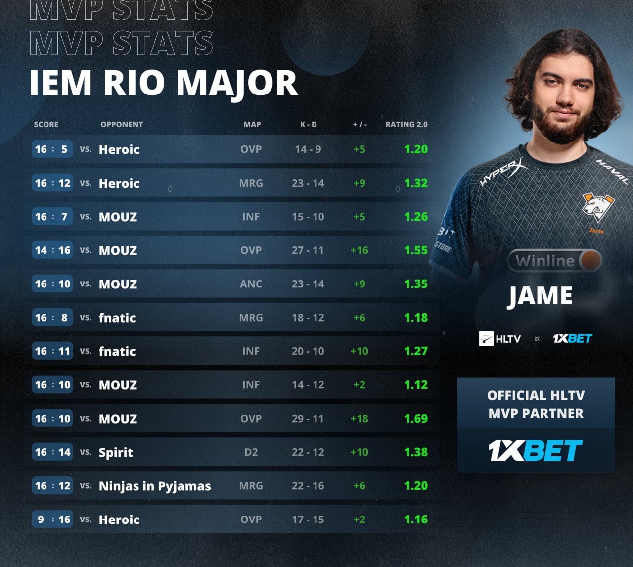 Капитан и снайпер Outsiders Джами Jame Али стал лучшим игроком IEM Rio Major 2022 по версии портала HLTV.org. Во всех матчах плей-офф его соотношение убийств и смертей было больше единицы.