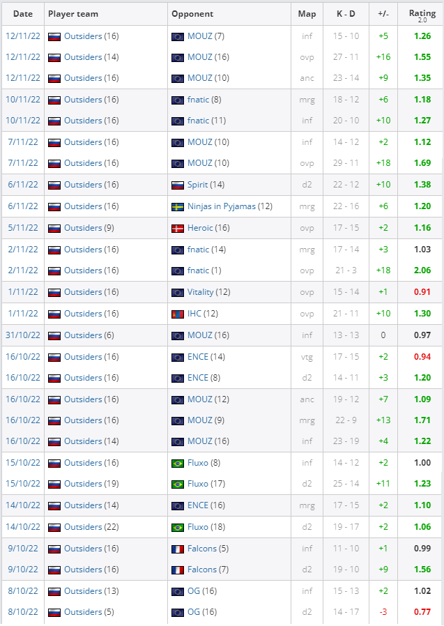 Снайпер состава Outsiders по CS:GO Али Jame Джами вышел в плюс по соотношению фрагов и смертей на 26 картах подряд. Последний раз россиянин играл “в минусе” аж 8 октября (на Dust2 против OG).