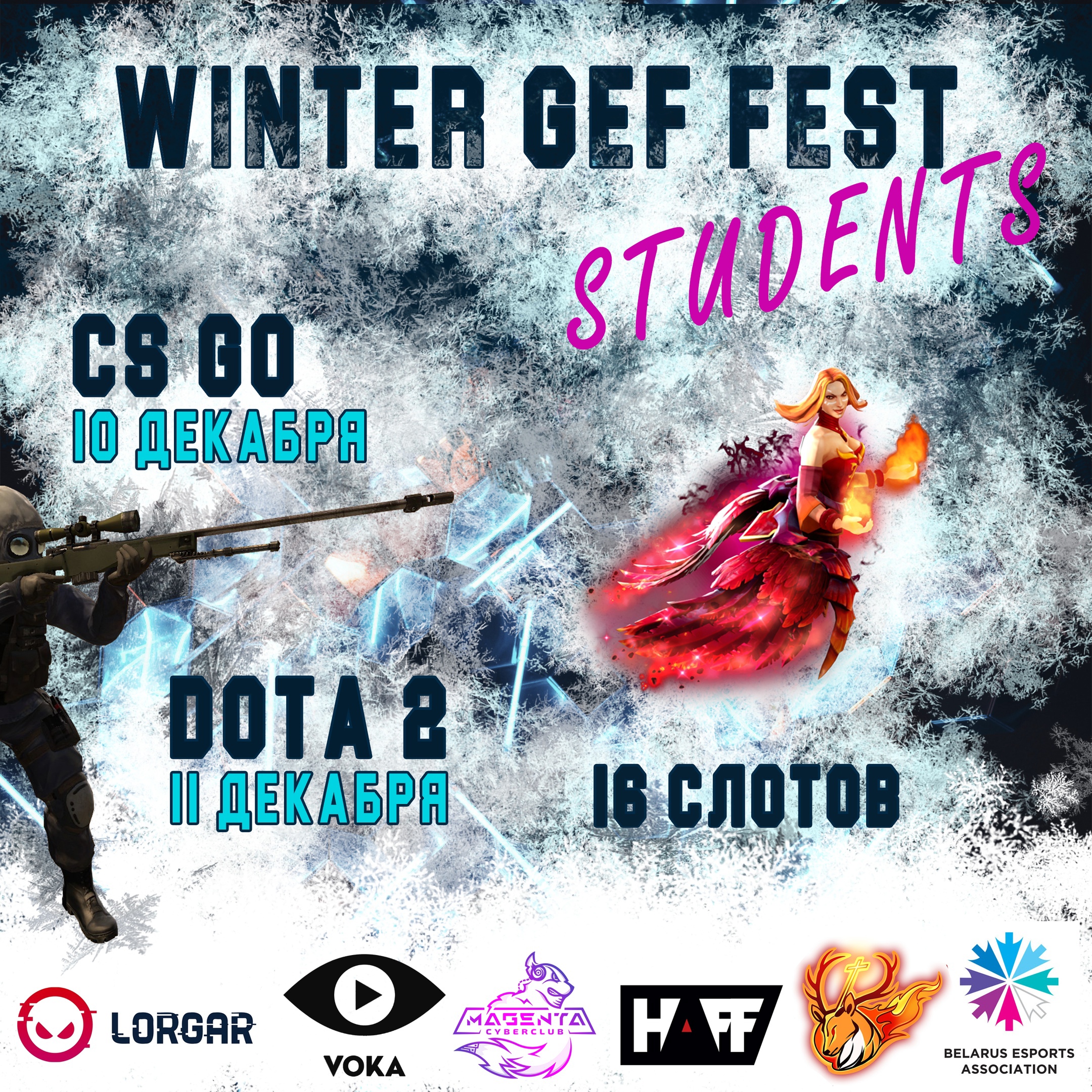 Гродненский компьютерный клуб Magenta открыл регистрацию на WINTER GEF FEST — LAN-турнир по CS:GO и Dota 2 среди учащихся и студентов разных учебных заведений. Главное требование к игрокам — в команде должно быть не менее 3 участников, получающих высшее либо среднее специальное образование в Гродненской области.