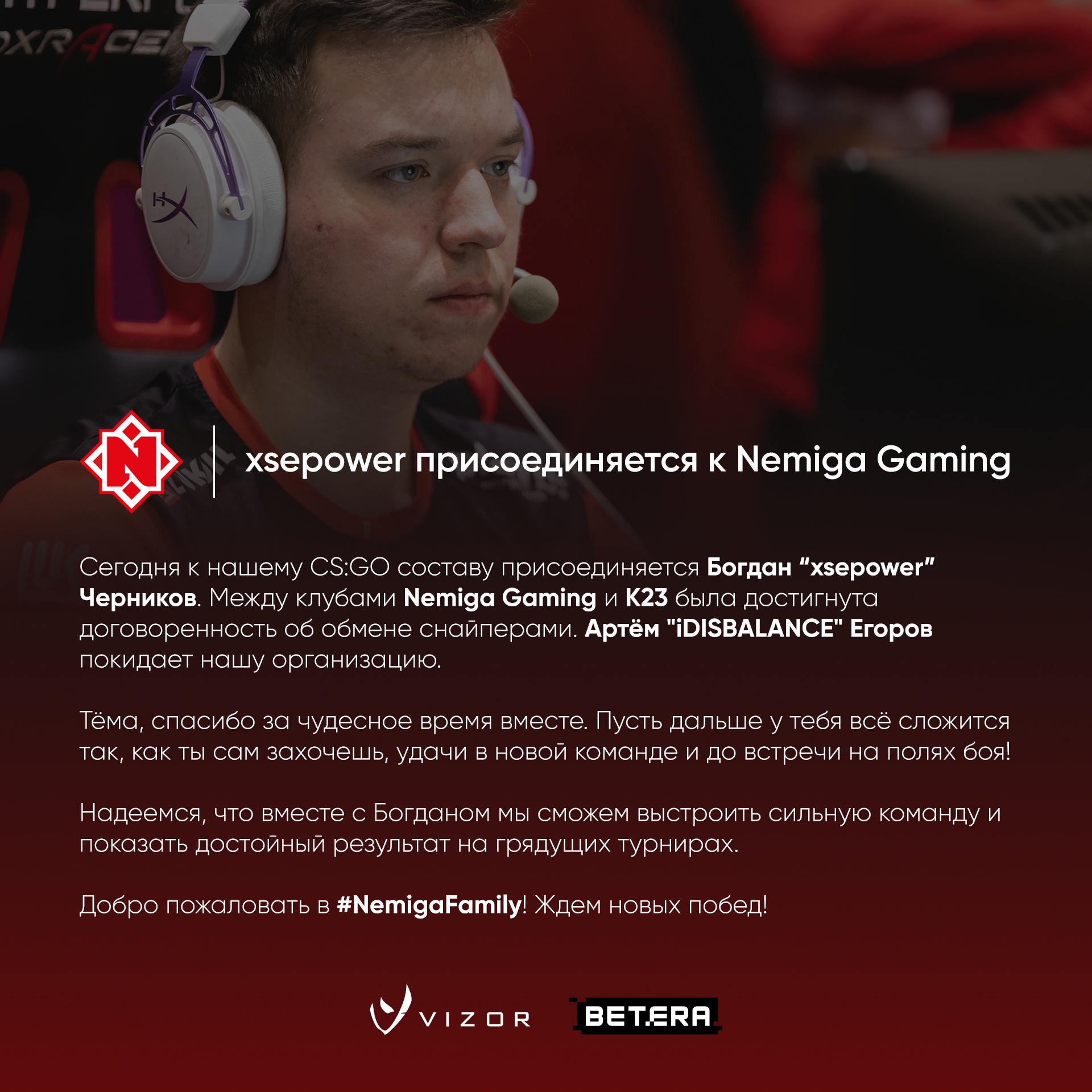 Богдан xsepower Черников присоединился к составу Nemiga Gaming по CS:GO. В команде он займет место Артема iDISBALANCE Егорова, который перейдет в К23. Между клубами была достигнута договоренность об обмене игроками.