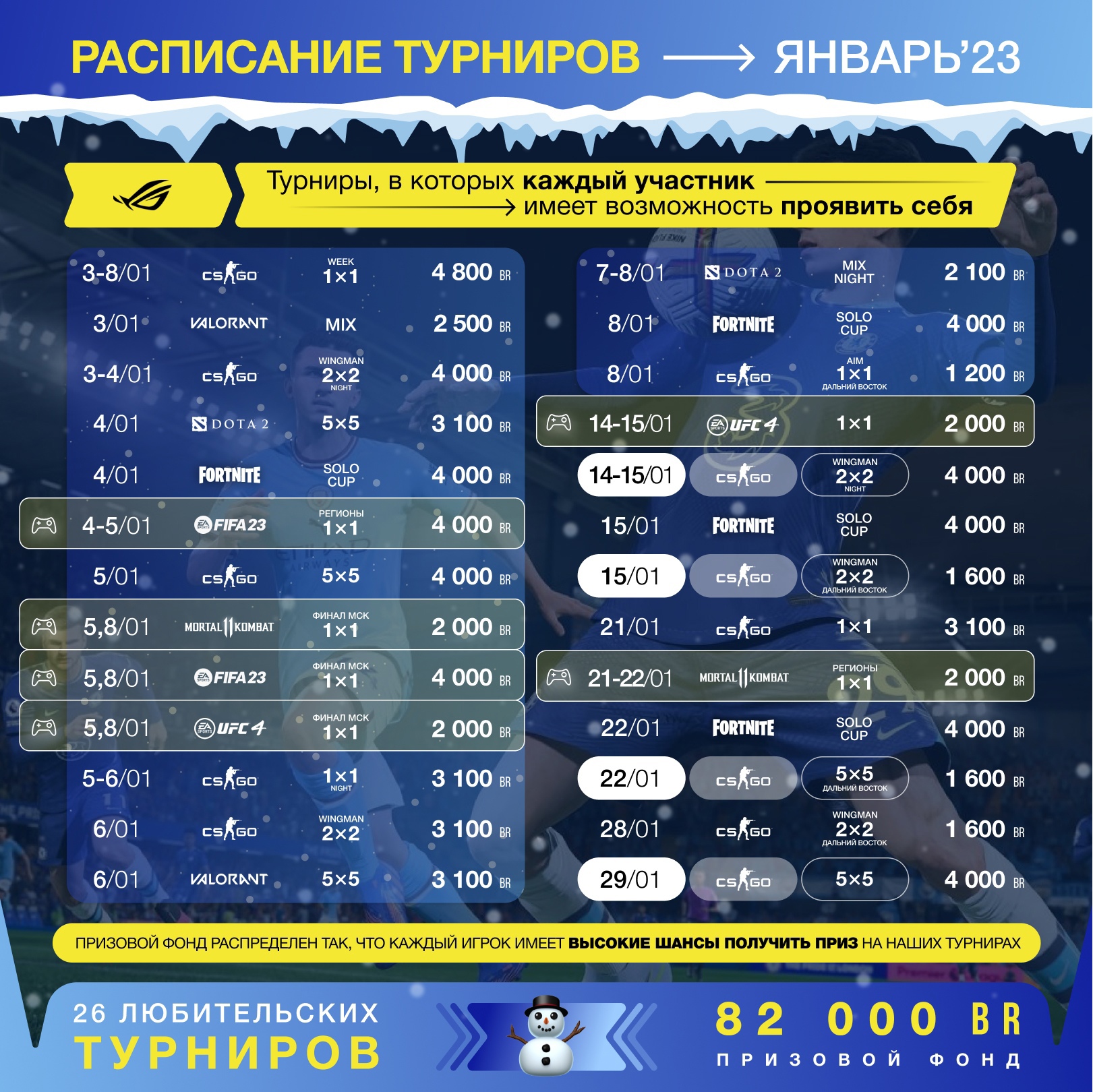 Минский компьютерный клуб COLIZEUM в январе 2023 года проведет 26 любительских турниров, 6 из которых пройдет на консолях. Суммарно будет разыграно 82 000 белорусских рублей. Турнирное расписание было опубликовано в официальном сообществе клуба в VK.