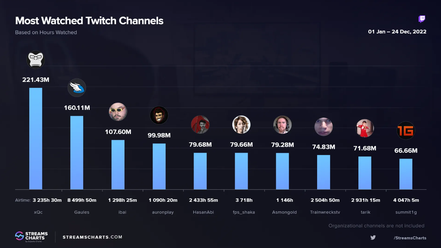 Аналитический портал Streams Charts опубликовал статистику самых популярных стримеров на Twitch в 2022 году. Наилучшие показатели оказались у бывшего профессионального игрока в Overwatch Феликса xQc Ленгьела. На втором месте оказался Александр Gaules Борба, а на третьем — Ибаи Ibai Льянос Гаратеа. Русскоязычные стримеры в рейтинг не попали.