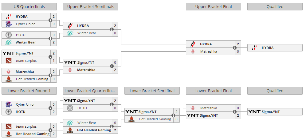 Завершились закрытые квалификации во второй дивизион зимнего тура DPC-лиги в Восточной Европе. Финалы нижней и верхней сетки закончились со счетом 2:0. По результатам отборочных сильнее всех оказались команды HYDRA (с белорусом HappyDyurara в составе) и Sigma.YNT (с белорусами kur0patbI4, foryou в составе).