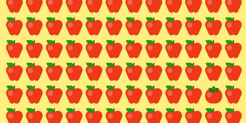Поиграем в эту увлекательную игру исследования! Представьте себе невероятный фруктовый сад, где в рядах яблок, внезапно прячется одинокий помидор. Ваша задача — обнаружить этот необычный элемент, который несмотря на окружение, решительно выбивается из общей картинки.