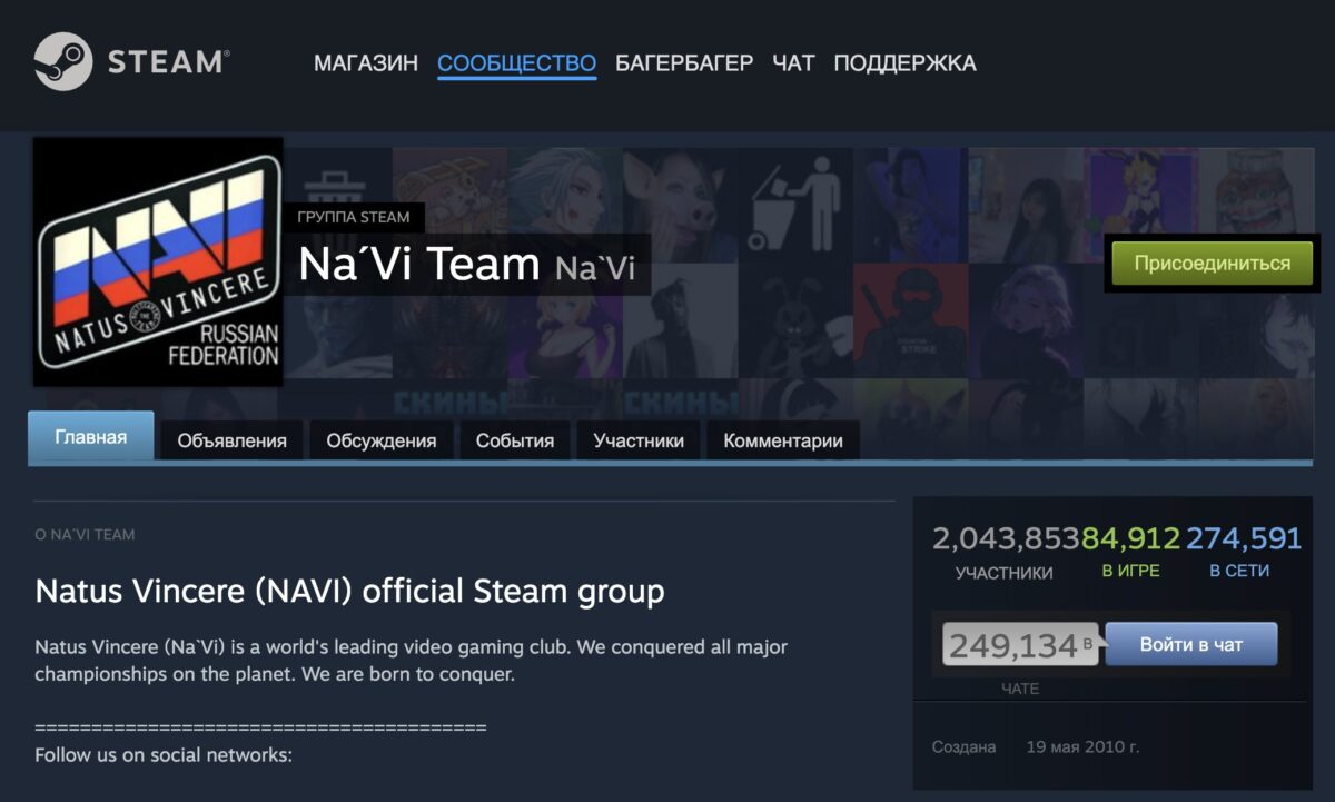Официальную группу украинской киберспортивной команды NAVI в Steam взломали. Хакеры изменили аватарку картинки и частично страницу и ее содержимое. Руководство коллектива пока не комментирует ситуацию.